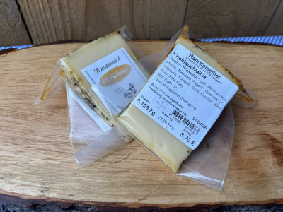 Der Knoblauchkäse vom Ramsteiner Hof ist ein würziger, halbfester Käse. Er schmeckt kräftig, herzhaft und leicht pikant mit einer Knoblauchnote. Ideal zu Brot, auf einer Vesperplatte oder zum Überbacken.